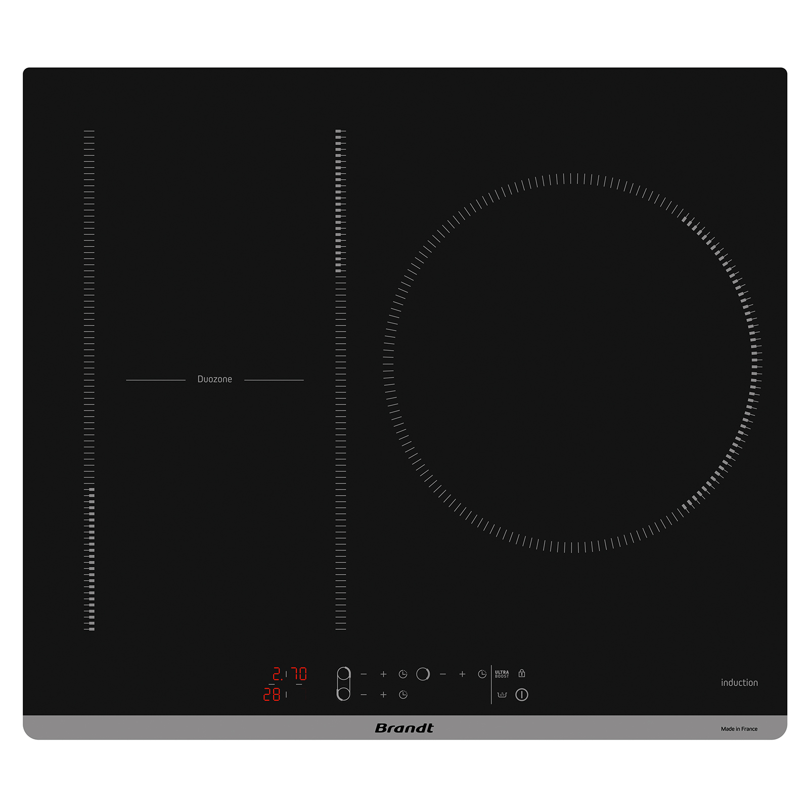 DuoZone is flexible and can be divided into two autonomous cooking zones for cooking either at the back, the front or both simultaneously, with appropriate power levels set for each type of preparation.