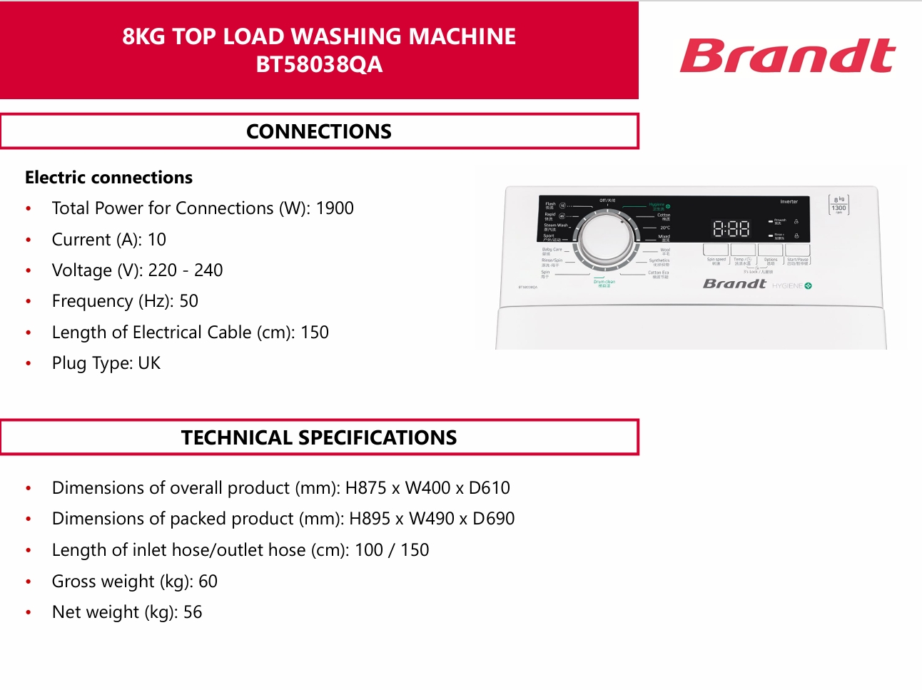 Brandt BT58038QA Top Load Washing Machine (8kg, 4 Ticks)