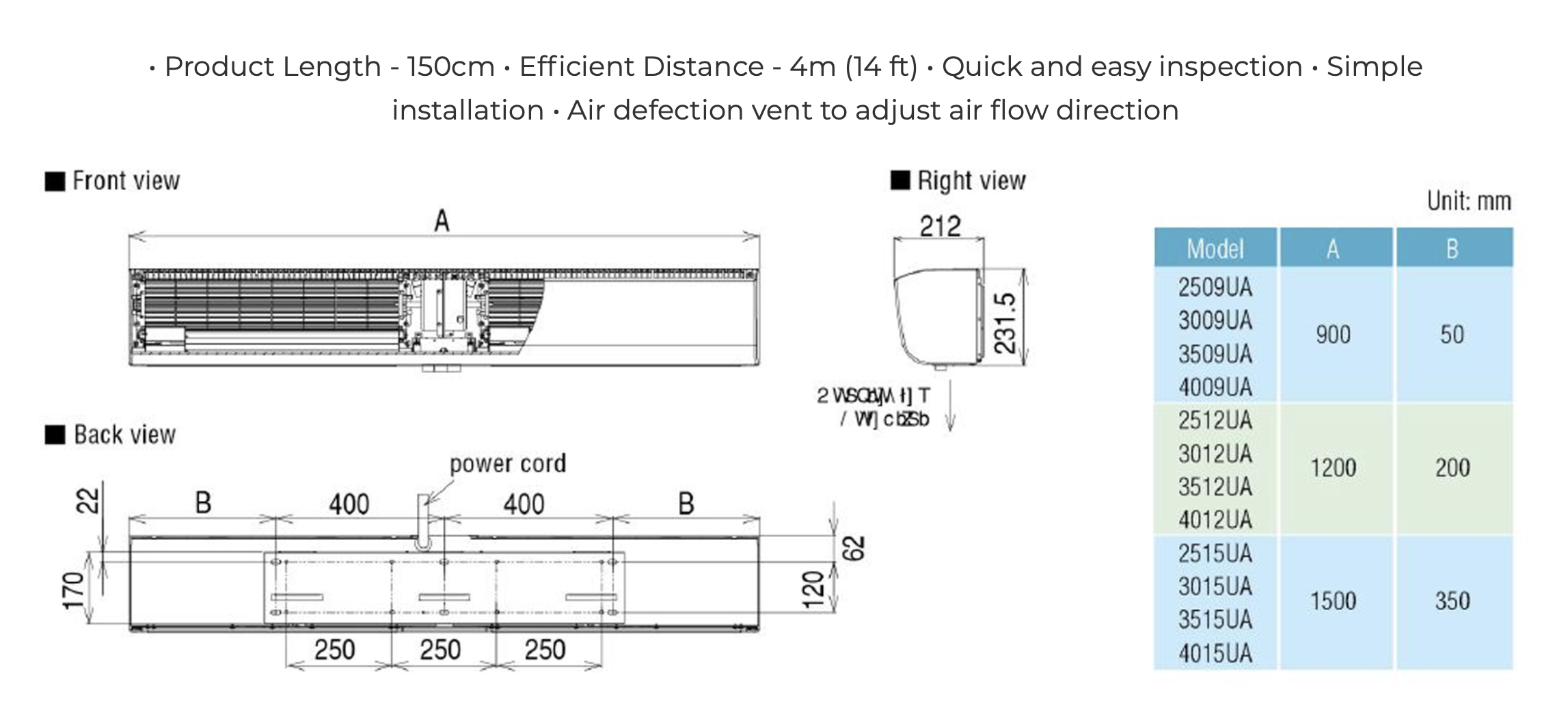 KDK 4009UA / 4012UA / 4015UA Air Curtain – Effective Distance : 4m (14 Feet)