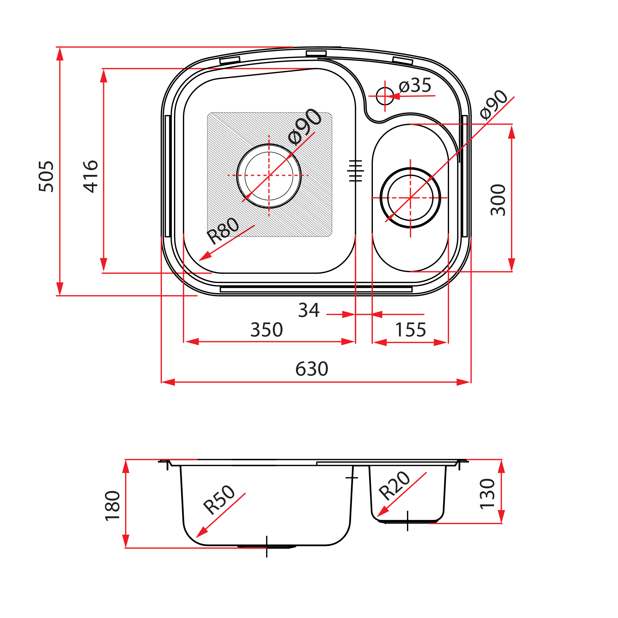 - Overall Dimension: 630 × 505 × 180/130 mm