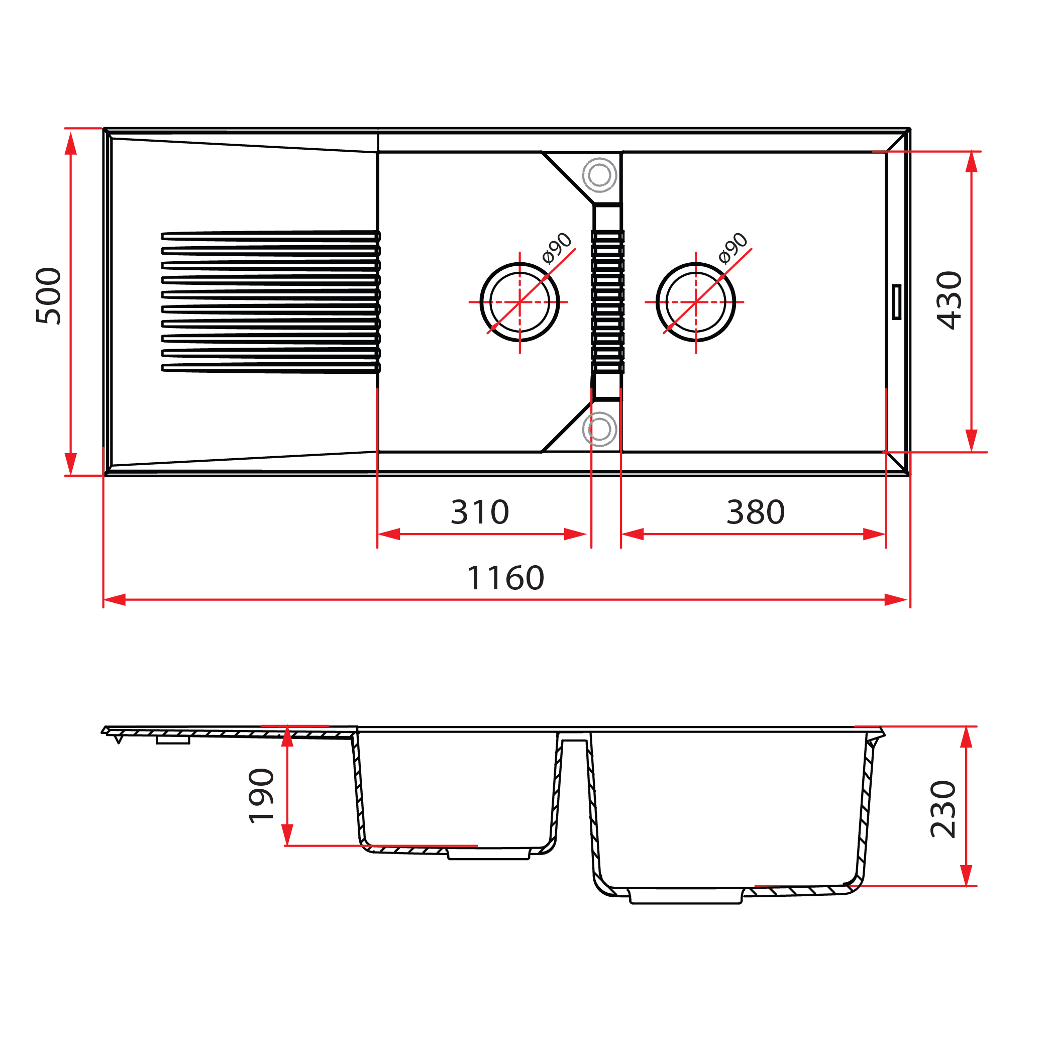 - Depth varies between the two bowls (190 mm and 230 mm)