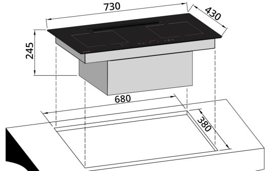 - 73cm 2-zone built-in induction hob with integrated downdraft hood