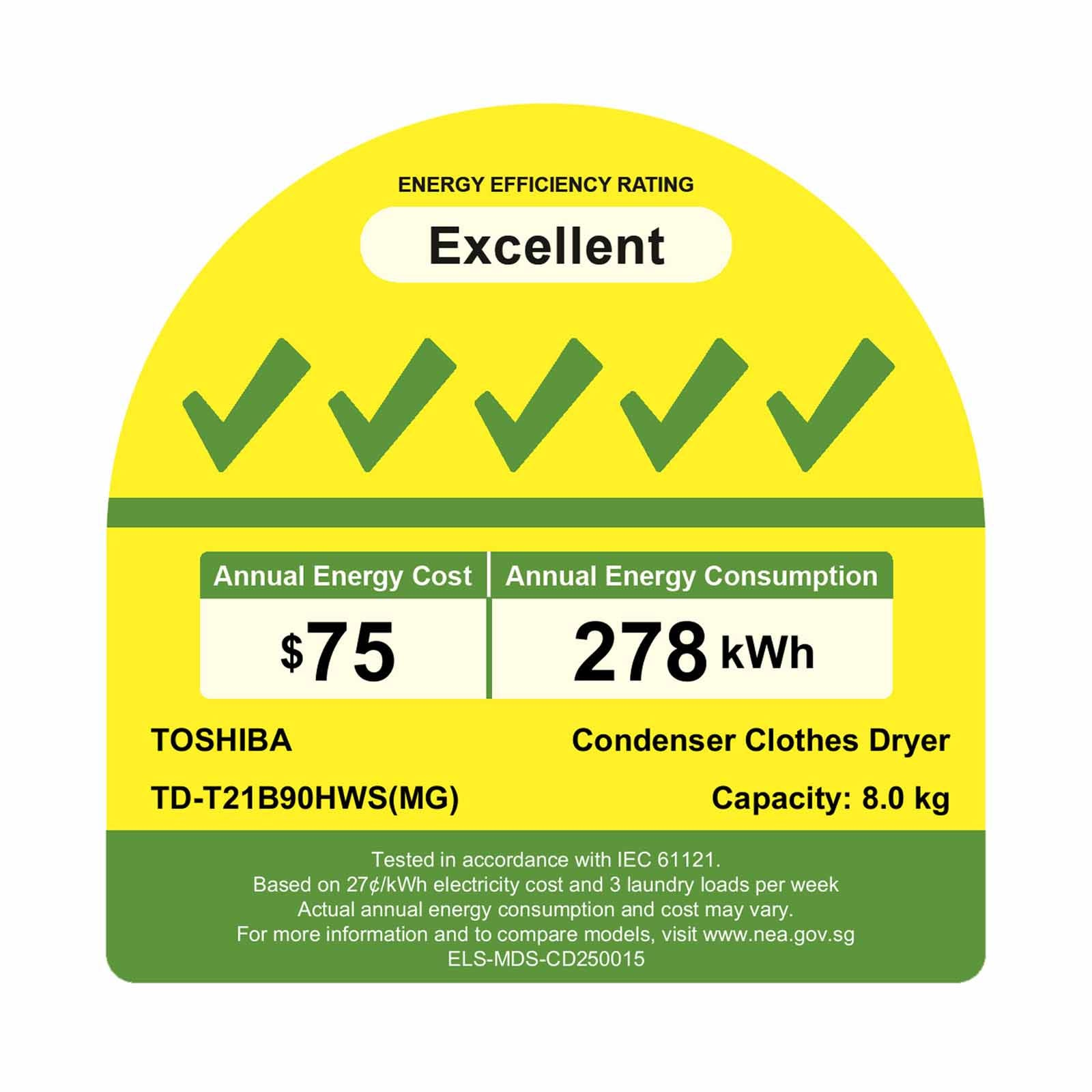 TOSHIBA TD-T21B90HWS(MG) HEAT PUMP DRYER (8KG) – 5 Ticks