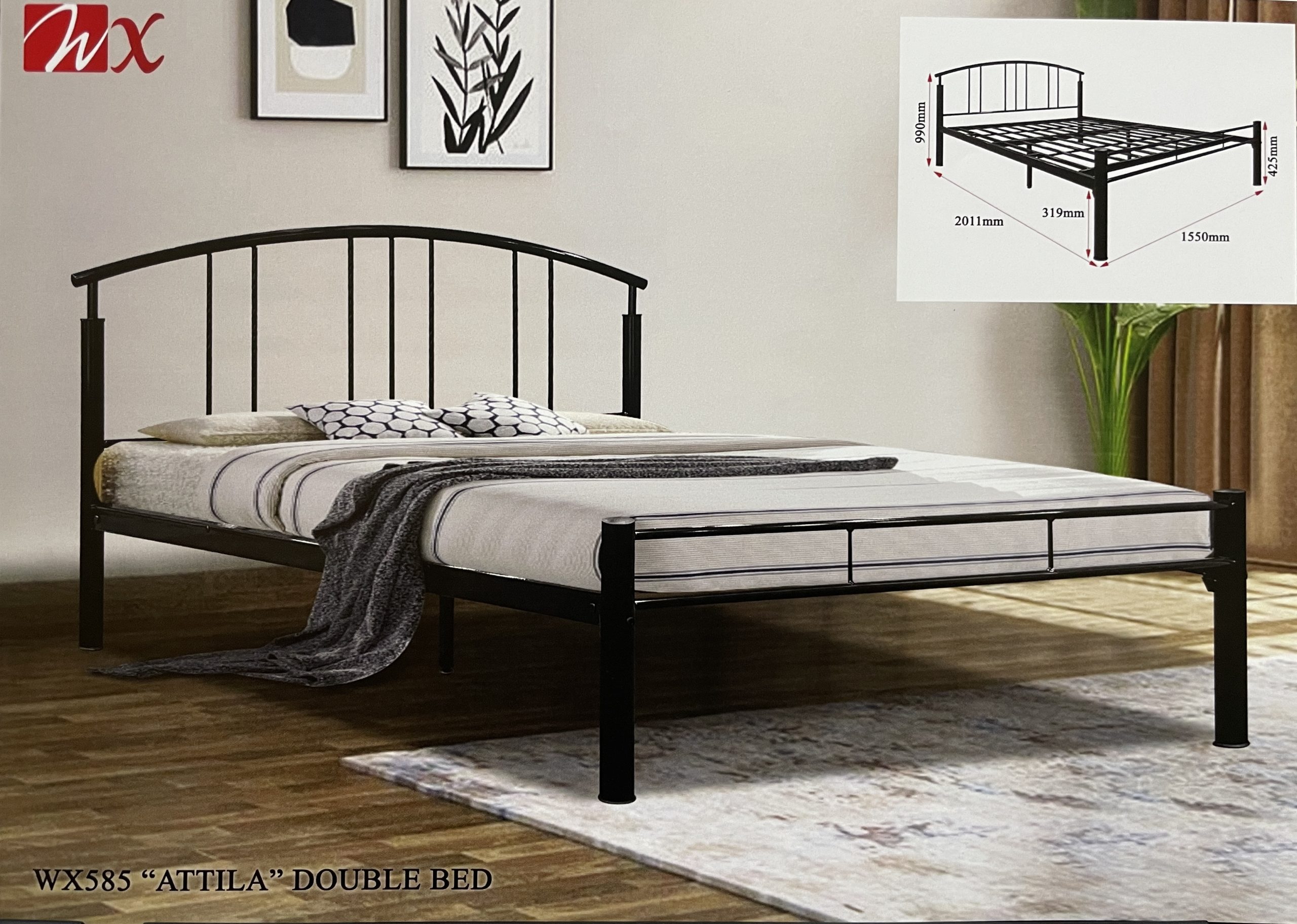 WX585 ATTILA Double Bed is a durable metal bed frame designed for stability and a classic aesthetic. It features a black finish and a reinforced frame suitable for various home environments.